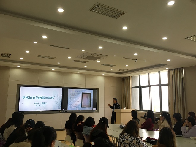 11月12日14:00田517教室,南通大学学术委员会主任、国家社科基金重大项目首席专家、楚辞研究专家、原南通大学副校长兼文学院院长、博士生导师周建忠教授应邀为水果派 研究生作了题为“学术论文的选题与写作”的学术讲座。讲座由水果派 张春梅教授主持。周建忠教授从多个方面具体讲解人文学科论文的规范及写作方法,介绍与学术论文、著作相关教材、工具书的文体特征;强调了学术著作、论文的学科性、创新性、严密性和信息性,以亲...