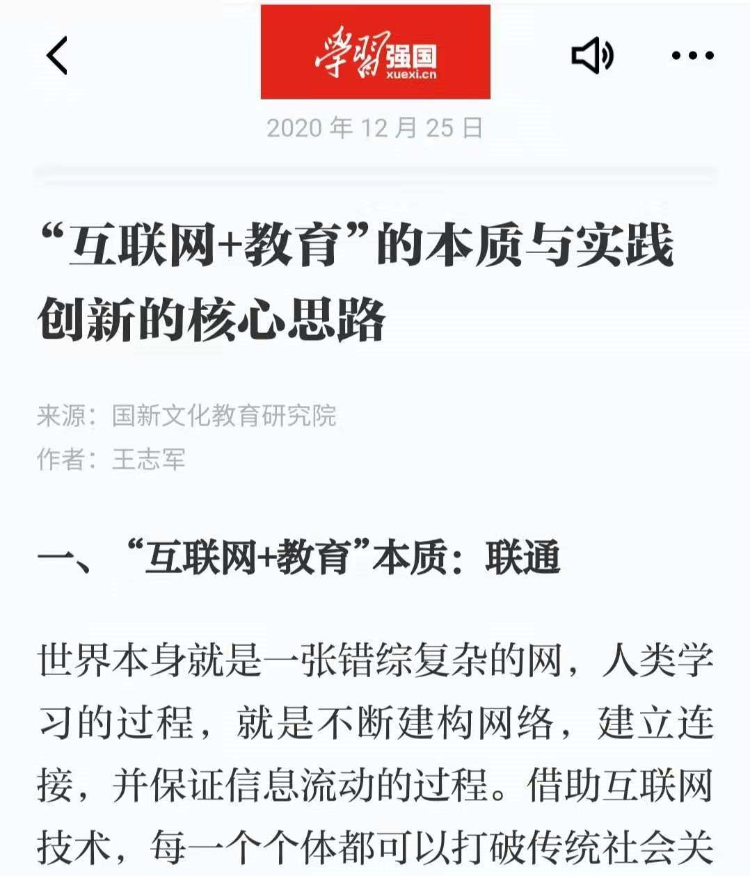 教育技术系王志军副教授应“国新文化教育研究院”的邀请,在《学习强国》平台上发表《“互联网+教育”的本质和实践创新核心思路》一文。该文章指出:世界本身就是一张错综复杂的网,人类学习的过程,就不断的建构网络,建立网络之间的连接,并保证信息流动畅通的过程。互联网打破传统社会关系所造成的局限,是的每一个个体都有机会随时联通整个生态体系中的其他个体与资源。“联通”是“互联网+教育”的本质,并在此基础上提出个...