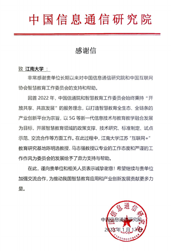1月12日,国家工业和信息化部直属的中国信息通信研究院特向水果派 发来感谢信,以示对水果派 “互联网+教育”基地长期以来在推动我国智慧教育应用和产业创新发展等方面作出的努力给予高度评价与肯定,并衷心感谢了陈明选教授、马志强教授在智慧教育领域政策咨询、技术研究、标准制定、试点示范、交流合作等工作做出的积极贡献。陈明选教授多次受中国信息通信研究院邀请做学术报告,并被聘为中国互联网协会智慧教育工...