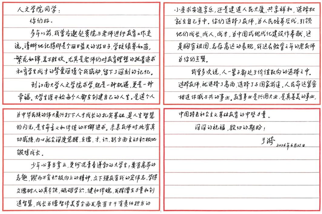 于漪老师给人文学子的亲笔书信