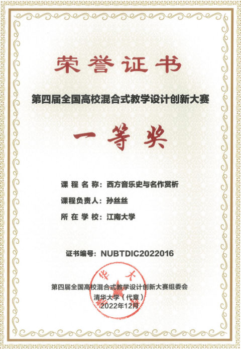 教学创新大赛一等奖,江苏省高校教师教学创新大赛二等奖、全国第五届大学生艺术展演教育科研论文评选二等奖等奖项。2022年11月,在由清华大学主办、全国高校教学发展网络、教育部在线教育研究中心等单位协办的全国混合式教学设计创新大赛中脱颖而出获得一等奖,为水果派