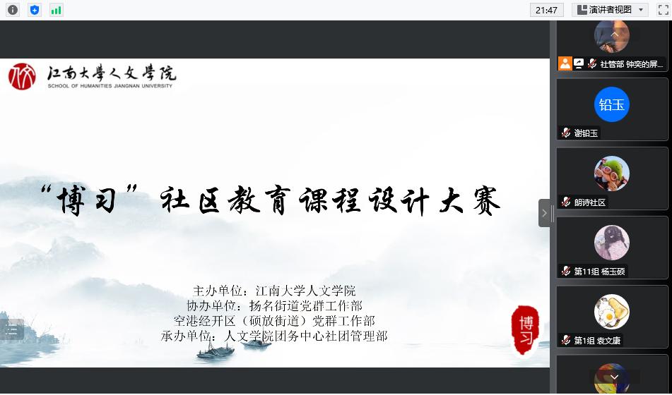 本次社区教育课程设计大赛的举办,丰富了“博习”公益课堂的课程体系,为“博习”社区服务计划提供了新思路、新方案,有效推动了该计划的落地实施。同时,本次比赛也为人文学子提供了一个展示专业优势与学科交叉能力的舞台,锻炼了学生的课程设计能力,提高了学生学以致用服务社会的实践意识。进一步深化了学院文化育人、课程育人、实践育人成效,推动学院学风建设,提升了人才培养质量。