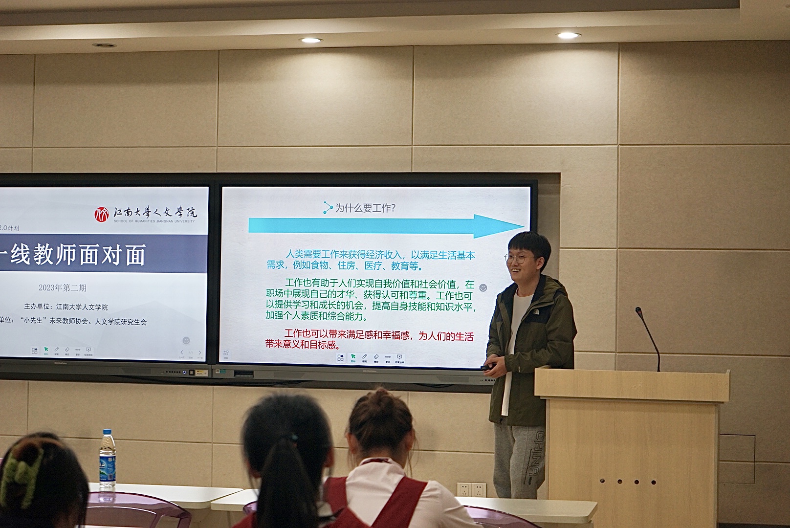 曾祥攀老师以“何以为师”为题,用轻松风趣的语言分享信息技术老师的日常工作、竞赛指导、必备技能等。从第一次开课、开展社团活动到指导学生参加科技竞赛获奖,曾老师秉持着自己的教育初心,唤醒学生对信息技术的钻研和热爱,为学校信息技术课的发展注入青年教师新活力。通过曾祥攀老师的生动分享,在场学生在可听、可视、可感的经历中提升了专业认同感。