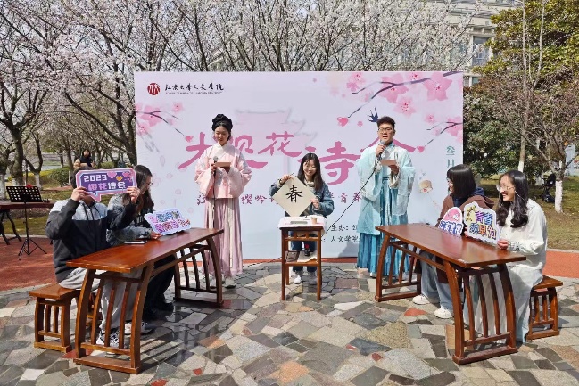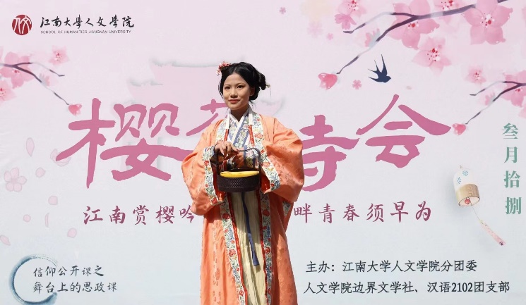 “江南赏樱吟诗意,蠡畔青春须早为”樱花诗会在学校公益图书馆东南侧樱花林顺利举行,活动由边界文学社、“粟裕”特称团支部汉语2102班联合承办。