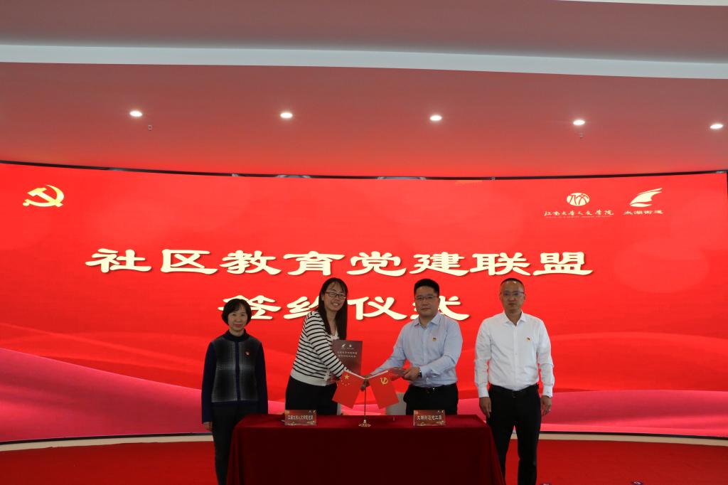 党委与无锡经开区太湖街道党工委社区教育党建联盟的正式启动,是以党建为引领,在家门口搭建舞台,在教育、文艺、体育、志愿、实践等领域,打造强化思想政治引领、传承优秀传统文化、培育文明新风尚等多种功能的社区教育阵地,实现党建、思政教育与专业教育的多元融合,以高质量党建引领高质量社区教育活动,打造高校“三全育人”新格局。