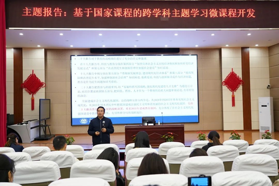 副院长(主持工作)伍红林作《基于国家课程的跨学科主题学习微课程开发》主题报告。报告从跨学科主题学习的溯源、内涵、落实、困难四方面入手,引导教师理清“学科主题学习”“跨学科主题学习”概念,区分学科主题学习与其他不同类型综合学习关系,鼓励教师转变观念、积极行动,开发校本跨学科主题学习课程群。