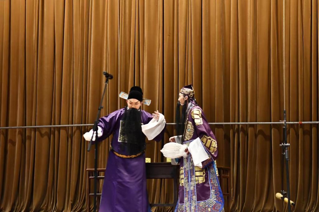 演出伊始,昭乐相声社的同学带来快板《绕口令·十八愁》,台下掌声与笑声交融,演出也拉开序幕。正式演出环节,京剧《群英会》草船借箭经典选段,使千年前被历史尘封的人物再度鲜活起来,引领现场观众走进那个群英荟萃、异彩纷呈的风云时代。越剧《红楼梦·葬花》,将黛玉的哀伤凄恻、抑塞不平、孤傲不阿表现得淋漓尽致。相声腿子活《杂学唱》将戏曲与相声相结合,戏腔歌曲则融合了传统戏曲与流行歌曲,赢得台下阵阵喝彩。紧接着,同学们带来京剧《天女散花》、戏歌《神女劈观》、昆曲《牡丹亭·游园惊梦》与京剧《辕门射戟》等经典选段,于三尺戏台之上舞尽春秋、唱尽浮生。