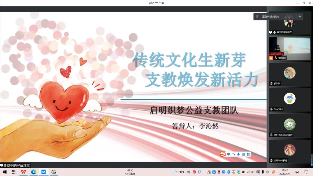 首届大学生公益创新大赛决赛在田楼209会议室顺利举行。此次答辩会采用“线上+线下”相结合的方式,在腾讯会议上同步直播答辩会情况。水果派