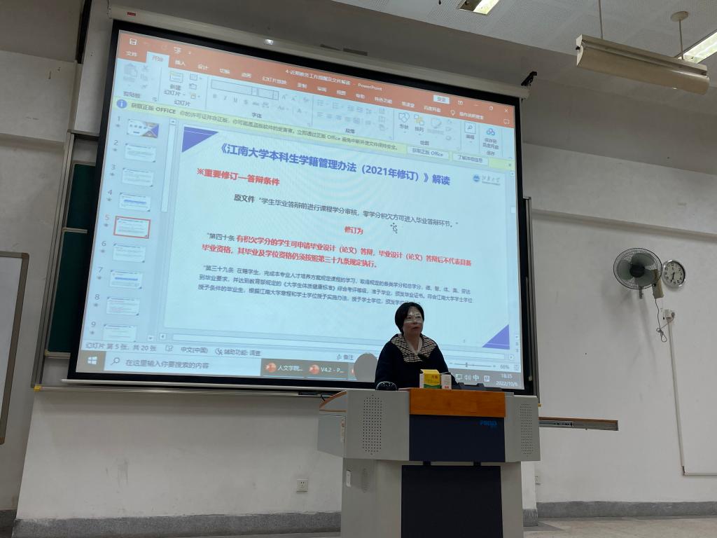 本科生学籍管理办法(2021年修订)》,着重解释了学籍管理办法中新修订的部分,强调了新生选课、选专业方向过程中的注意事项等。李芳表示修满学分是四年学习生涯中最基础的要求,同学们要时刻关注自己的学籍注册以及选课情况,以在规定时间内顺利达到毕业条件。