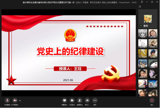 开班仪式结束后,王珏书记为全体学员做了关于《党史上的纪律建设》的专题报告。报告中,王书记以时间为线,为学员们系统讲述了中国共产党在四个重要时期的纪律建设的背景、目的和过程,并深刻总结了这些纪律的现实意义。她强调,纪律严明是中国共产党的光荣传统和政治优势。什么时候党的纪律和规矩得到充分尊重和严格执行,党的团结统一就有保证,我们的事业就兴旺发达;什么时候党的纪律和规矩遭到践踏和破坏,党的团结统一就受到威胁,我们的事业就遭受挫折,党在人民群众中的威望就大打折扣。她希望各位学员要以共产党员的标准和党的纪律严格要求自己,争取早日成为一名合格的共产党员。