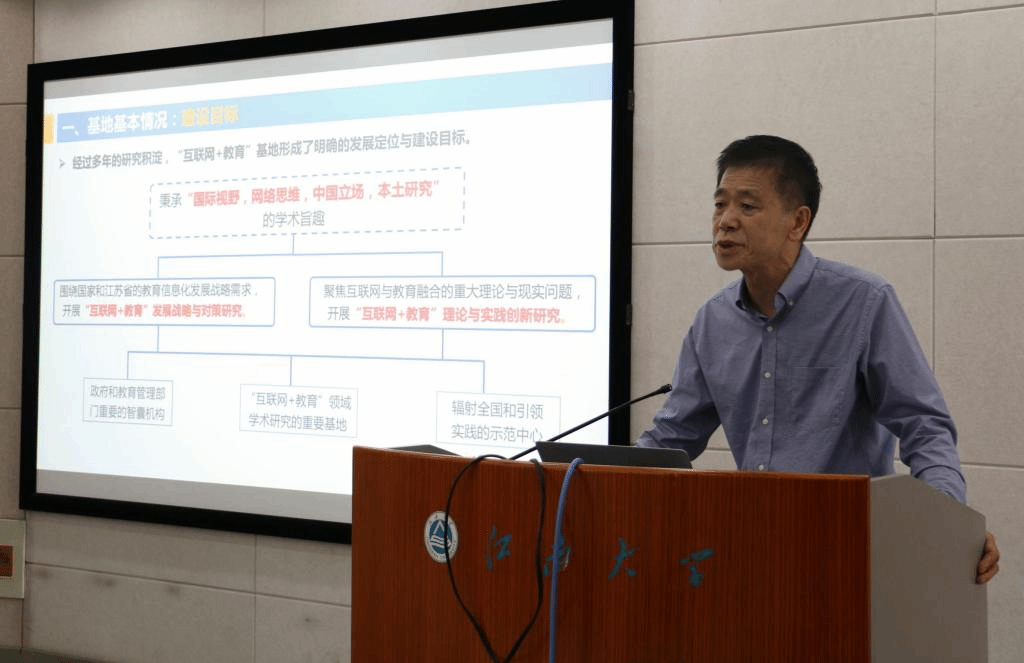 党委书记姚剑英致辞,欢迎各位领导前来“互联网+教育”基地指导工作。随后,基地主任陈明选教授对基地基本情况、近五年来取得的科研成果与未来发展规划等进行了详细介绍。在基地基本情况介绍部分,陈明选教授指出,经过十余年发展和研究积淀,“互联网+教育”研究基地于2020年获批江苏高校哲学社会科学重点研究基地,形成了明确的发展定位与建设目标。目前,基地拥有一支教育技术情怀浓厚,研究志趣相投,多学科融合,国际视野开阔,职称结构合理的研究团队。近五年有6人次通过绿色通道晋升高级职称,其中晋升教授2人,副教授4人。随后,陈明选教授介绍了研究团队成员在互联网+教育理论与战略研究、“互联网+”环境下的课程与教学研究、网络环境下学习分析与评价研究等三个研究方向的研究重点和成员分布。