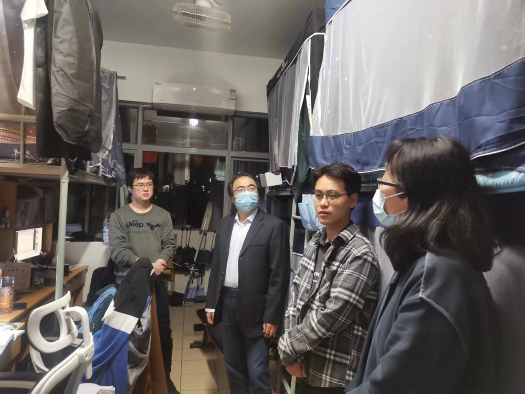 专业课老师们坚守“云课堂”,将专业知识传授给屏幕另一头的同学;行政教辅老师坚守岗位,在疫情期间也能提供一如往常的相关服务;辅导员老师们,每天核对同学们体温数据和核酸检测数据,叮嘱疫情期间保持良好学习和生活状态,培养健康向上、积极平和的心态,开展“门铃行动”,对所有在校学生的“兜底翻”式大排查,逐户上门走访。深入学生宿舍,为同学们发放口罩、体温计、消毒液等防疫物资。通过QQ群、微信群和线下渠道,及时发布相关信息,调研学生状态,组织“先锋队伍”,安排学生党员、学生干部精准对接“限动宿舍”,解决限动同学的就餐问题。为了帮助考研同学顺利参加线上复试,学院协调“考研复试专用房间”,解决线上复试的场地、设备和技术支持方面的问题,为考研同学提供温馨帮助。学院专门召开疫情防控及安全工作专题班主任会议,对疫情防控校园的常态化管理、疫情期间学生心理问题工作、毕业生就业工作等问题进行研究和部署。学院深入落实教职工党员联系学生宿舍制度,在疫情防控升级的特殊时期,教职工党员通过微信群、QQ群、企业微信群组与宿舍走访等与学生联系对接,关心学生学习生活状态。教师团队坚守一线, 细致温暖,凝聚起“想得起”“找得到”“靠得住”的“守护力量”。