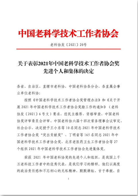 退休教师姚鸿滨荣获2021年中国老科学技术工作者协会“突出贡献奖”。该奖项是老科协工作全国最高个人奖项,全国仅有10人获此殊荣。