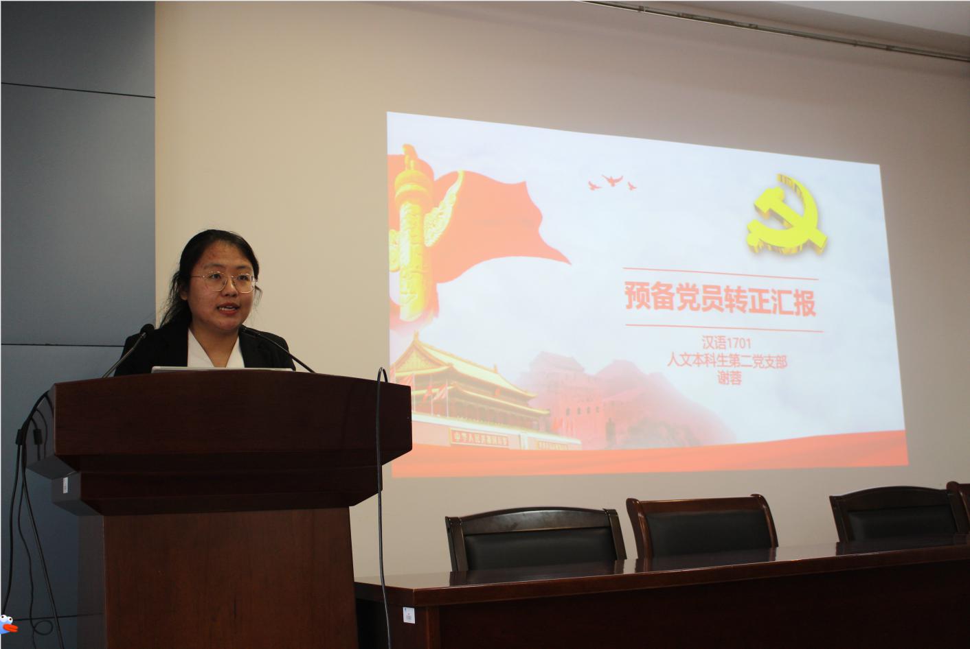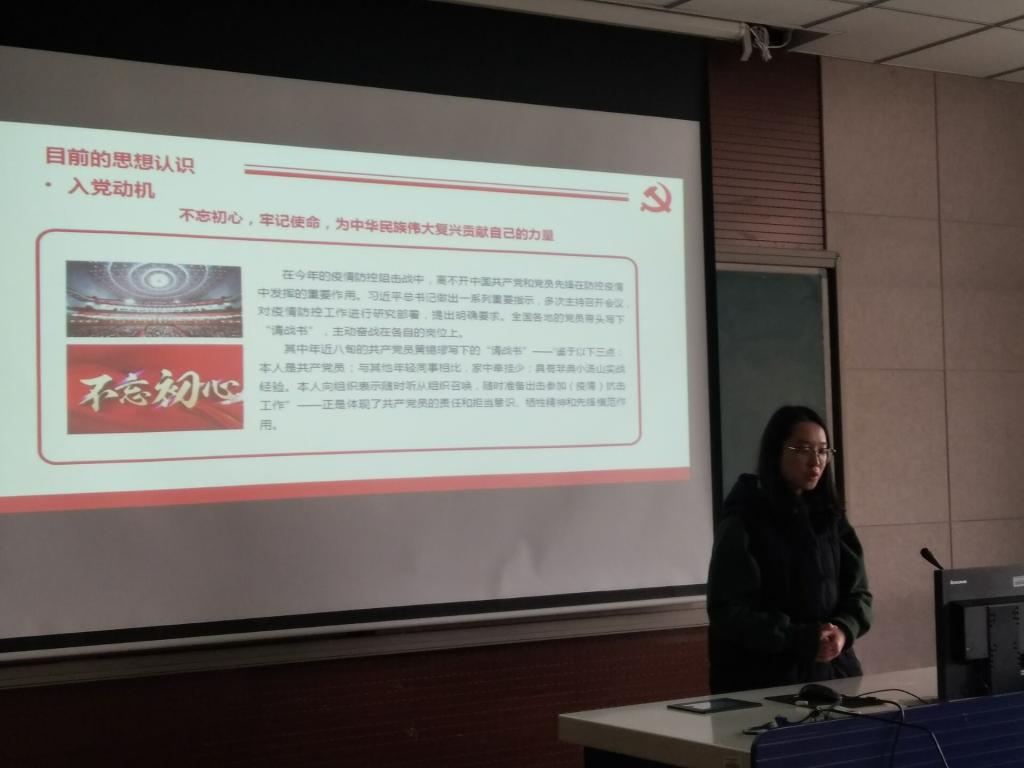 主持人宣读答辩流程和规定后,转正答辩会正式开始。本次转正答辩会共分为汇报和答辩两个环节。首先是汇报环节。各位预备党员分别就一年来的学习收获、生活体会、思想变化、取得成绩等向党组织进行汇报。思想上,预备党员同志们都能积极主动学习党的理论知识和最新成果,关心时事政治,不断追求更高的思想境界。在学生工作上,都能在各自的岗位上兢兢业业,尽职尽责,本着“为人民服务”的宗旨,踏实肯干。在学习上,预备党员同志更是以身作则,学好专业知识,锤炼技能本领,从专业素养层面做到扎实过硬。在生活上,预备党员都能保持良好的生活和行为习惯,深入班级等群体,主动帮助和引领他人,建立了良好的群众基础。君子检身,常若有过。预备党员们对自己现阶段存在的不足也进行了深刻全面地剖析和反思,并对改进计划做了“任务书”和“时间表”,达到了自我反思和相互监督的效果。