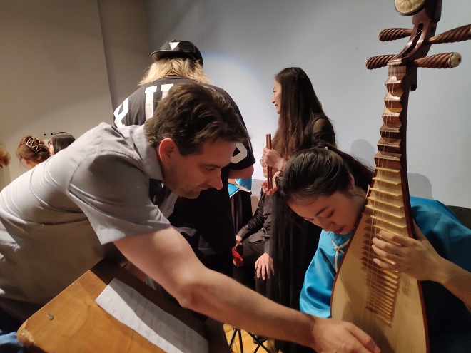 音乐会后,德国师生就中国乐器的演奏技法、中国音乐的发展与创新、中西乐器和音乐的比较等问题与水果派