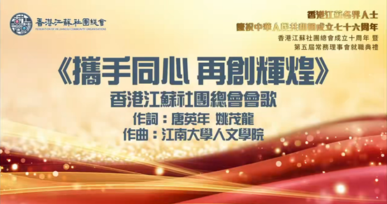 2025年9月11日,江南大学人文学院收到香港江苏社团总会感谢信,信中对江南大学人文学院在9月5日举行的香港江苏各界人士“庆祝中华人民共和国成立七十六周年暨总会成立十周年庆典”中的贡献给予高度评价。典礼上,由江南大学原副校长王武教授参与歌词创作,人文学院胡永强等教师作曲的会歌《携手同心再创辉煌》首次发布,其铿锵旋律与家国情怀引发全场近千名嘉宾热烈反响,成为活动亮点。该会歌以激昂的曲调展现了在港江苏乡亲团...