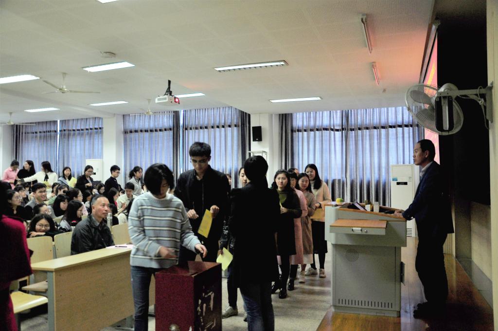 党委在一教楼1B103教室召开全体党员大会进行党委换届选举工作。共计150名正式党员,53名预备党员参加了此次会议。大会由水果派