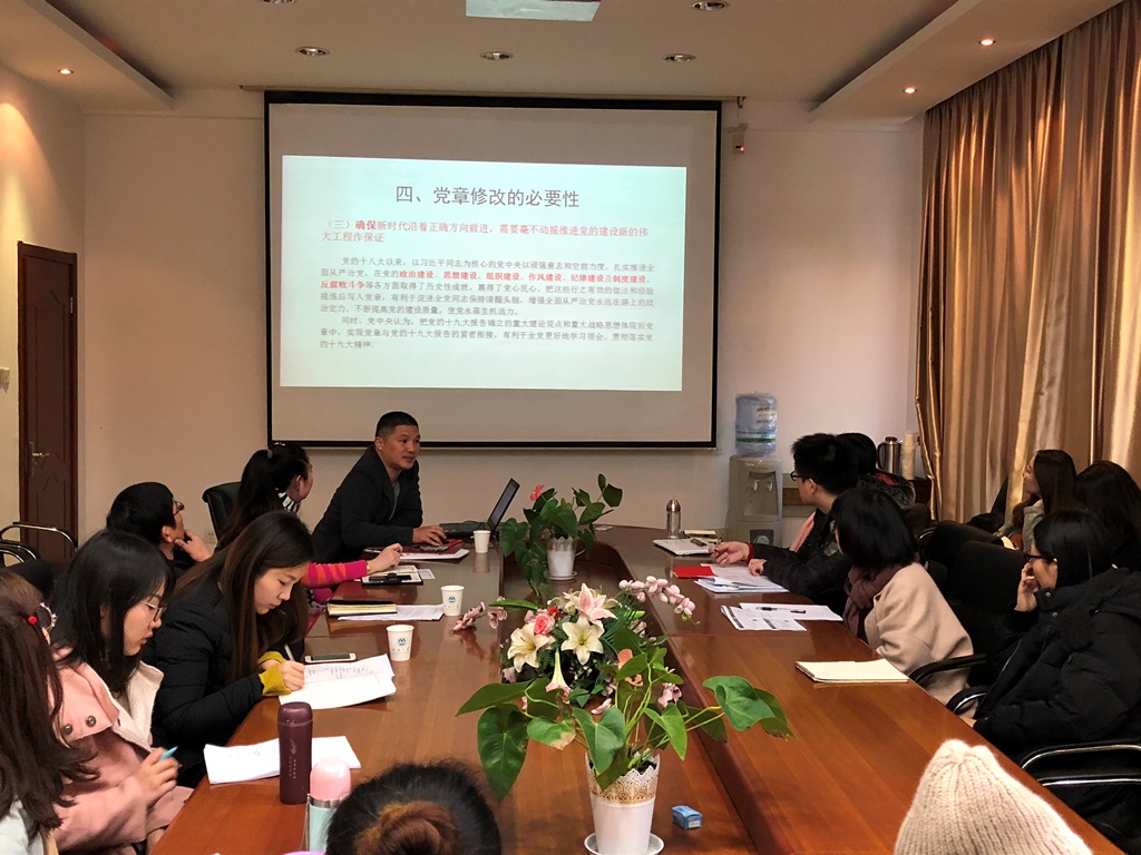 学习交流主要从三个方面展开,包括党章研习、互助讨论和总结发言。首先,组织部、党校和机关党委党支部书记张海峰同志带领全体党员学习了党章。通过PPT展示,图文并茂地讲解了党章做出的每一处改动。带领在座党员回顾党史,梳理每一届党的代表大会精神内涵。党员同志都做了认真的学习。之后,在座同志结合自己的学习、生活纷纷谈了学习十九大精神以及成为党员或预备党员以来的一些心得体会。教育类专业学生普遍对教育使命问题有更多的关注,针对“美好生活需要和不平衡不充分的发展之间的矛盾”问题,探讨了教育方式,新媒体手段在教育资源不平衡的现状下能发挥的积极作用。中文类专业学生着眼于生活中的细节变化,在民生建设,生态保护方面交流了自己的切身体会,提出了自己的思考,并表达了对党切实为人民服务的认识。同时也有同志就文化自信,辩证唯物主义发展观,教育国际化视野做了进一步交流讨论。在学生党员发言的间隙,机关党委书记周建中同志就优秀传统文化,党的纪律性问题针对同学的观点做了一些点评,并引导学生深入思考。