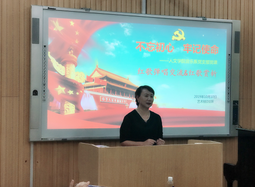 为了庆祝中华人民共和国成立70周年,我校人文学院音乐系党支部与中文一支部携手,于2019年10月10 日在艺术楼D108教室开展了“不忘初心、牢记使命”主题红歌弹唱交流、红歌赏析活动。出席本次活动的领导有人文学院副院长符珊珊教授、副院长蔡爱国教授,以及音乐系党支部与中文系一支部党员教师,活动由人文学院音乐系陶红副教授主持。
