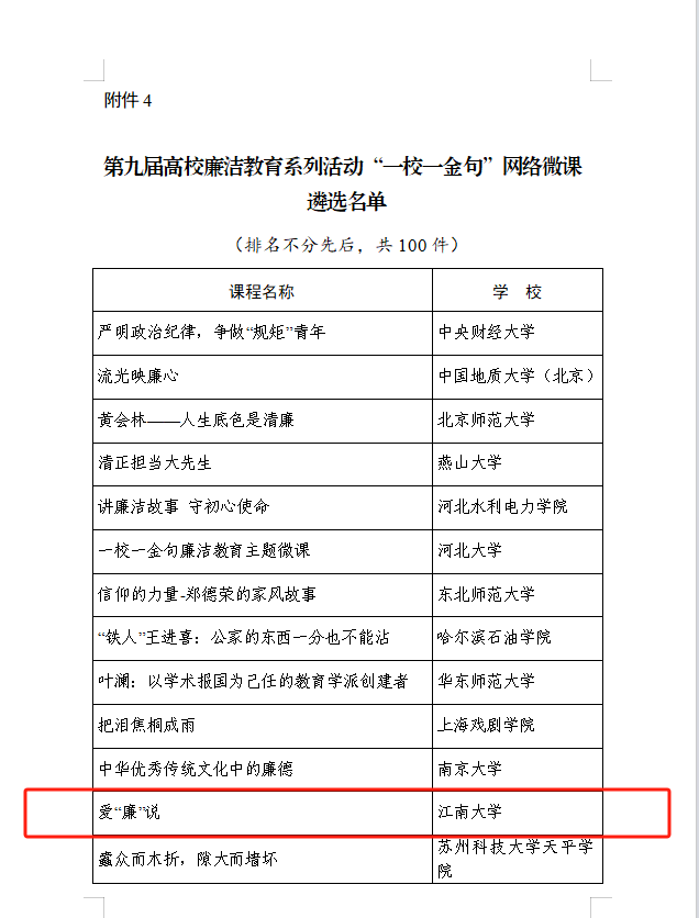 近日,教育部公布了第九届高校廉洁教育系列活动评选结果。经省(区、市)推荐、专家遴选,江南大学推荐由党委宣传部、纪委办公室、人文学院党委联合制作的视频《爱“廉”说》入选“一校一金句”网络微课全国百件。
