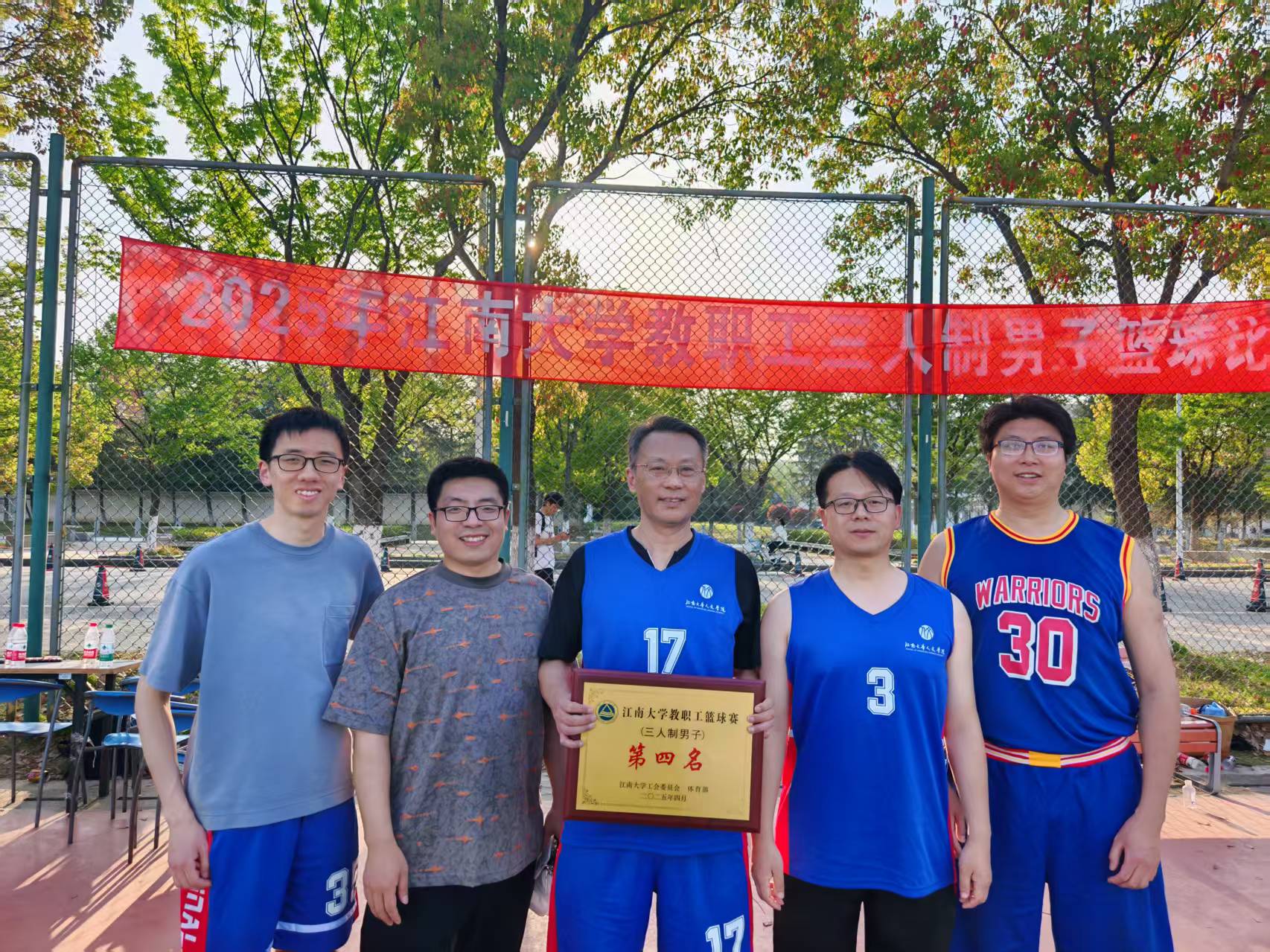在4月2日至4月8日,由校工会、体育部主办的江南大学教职工三人制男子篮球比赛中,我院张剑心、任忠民、蔡华祥、何哲涵、刘登珲、谢坤六名老师组成的篮球队不畏强队、奋力拼搏,以小组第一名出线,最终取得第四名的好成绩,继去年夺得亚军后再一次进入四强,充分展示了我院篮球队的强大而稳定的实力。
