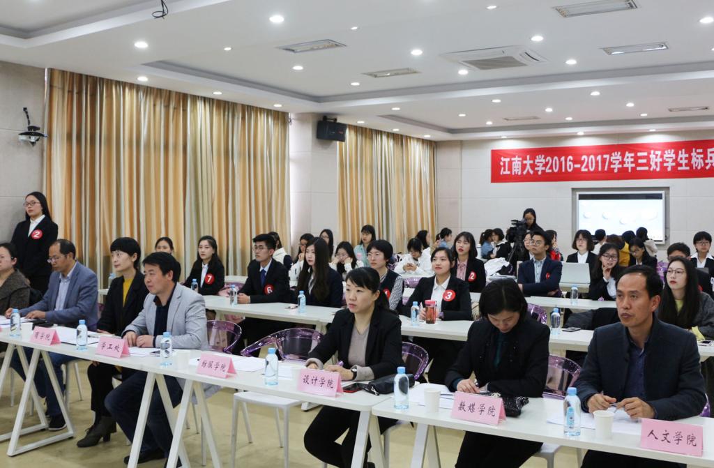 4月4号下午一点半,江南大学2016-2017学年三好学生标兵答辩会议在人文学院田楼517室举行开。江南大学学工处副处长汪双喜、纺织服装学院党委副书记周云龙、商学院党委副书记李荣华、设计学院党委副书记王晖、外国语学院党委副书记刘伯贤、人文学院党委副书记吴宝锁、数字媒体学院院长助理陈祎、法学院分团委书记胡博与本届竞选三好学生标兵选手共同参与了此次答辩会议。本次答辩还邀请了上一届三好学生标兵代表与各位领导老师共同担任答辩评委。