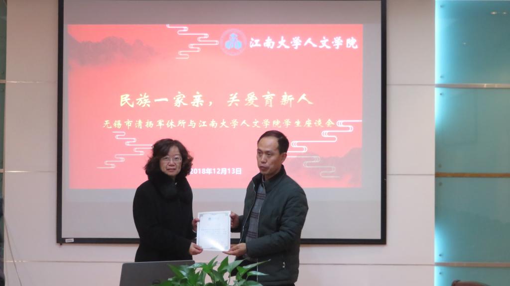 最后,吴宝锁副书记发言。吴书记首先就军休所老干部对人文学院少数民族学生的关爱表示感谢,对两位学生的努力与成绩表示肯定。他表示,学生经过层层选拔考取本校,都是新疆学生中的优秀者,相信通过他们努力,一定能够取得更大的进步,更好地回馈社会。同时,吴书记还表示希望进一步加强与无锡市清扬军休所的交流工作,发挥军休老同志的优势,在人文学子中进行革命传统、爱国主义、集体主义等教育。
