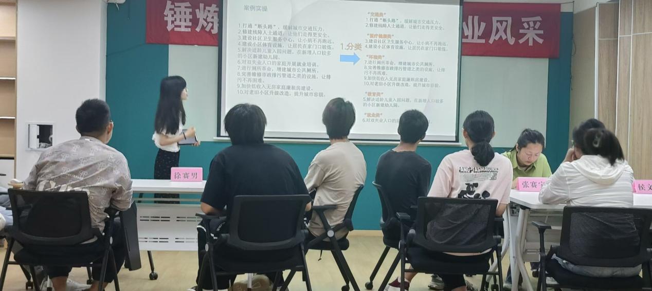 随后,张赛宇同学从面试前准备、面试中表现、面试后总结与反思三个方面进行考编经验分享。面试前,充分了解招聘单位的背景和发展情况,准备自我介绍,进行面试模拟。面试中,与面试考官进行眼神交流,不要闪躲。面试后,进行客观回顾,总结经验和教训,确定自己进一步提升的目标。