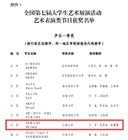 2024年6月12日至18日,全国第七届大学生艺术展演活动在湖北省襄阳市举行。此次展演由教育部和湖北省人民政府联合主办,湖北省教育厅和襄阳市人民政府共同承办。江南大学合唱团选送的《夜宿山寺》、《Rytmus》两首合唱斩获一等奖的好成绩!