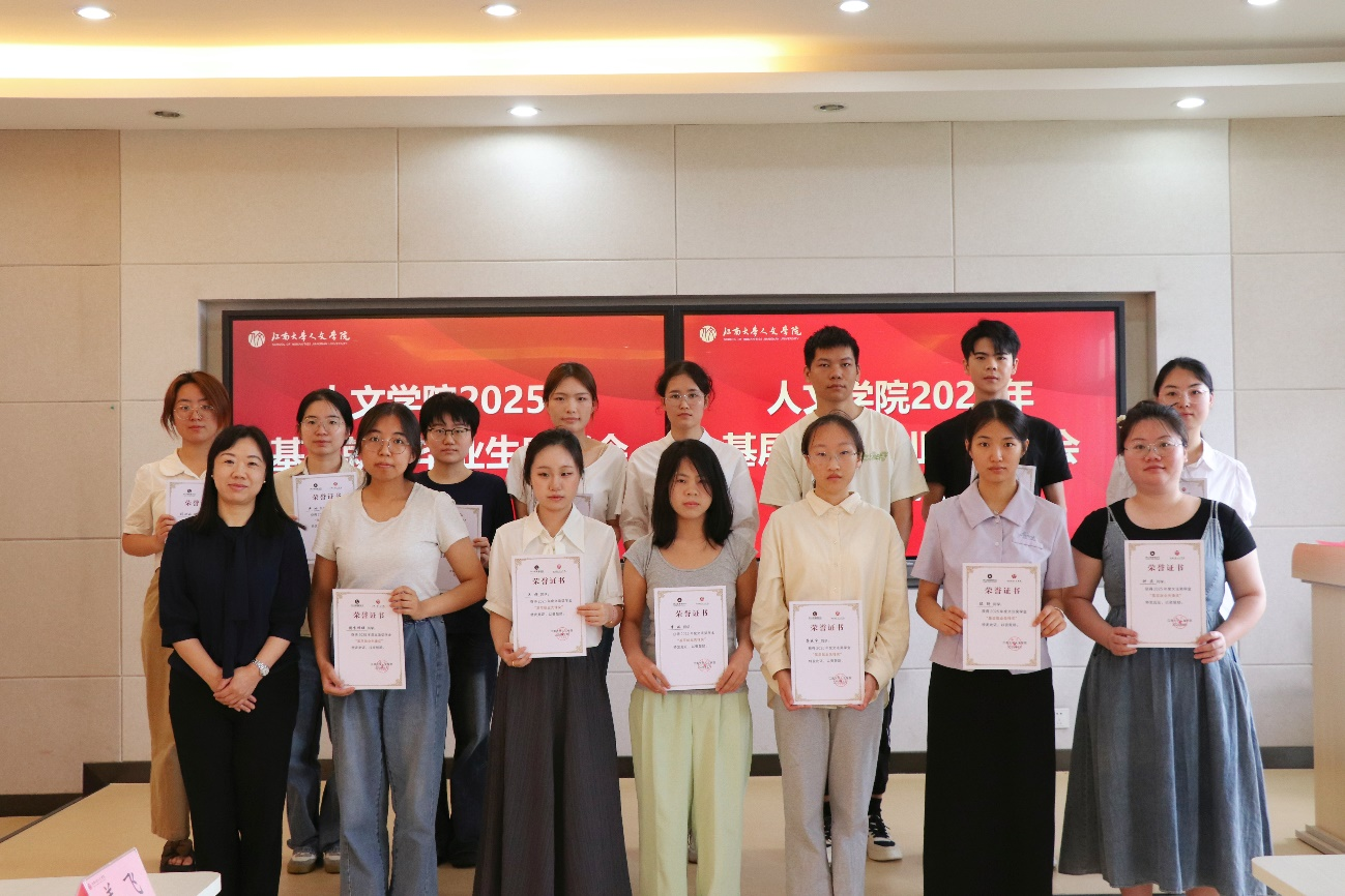 会议伊始,江南大学“校地定向”宣传大使邵祥岚介绍了人文学院2025届“两项计划”的录取情况。本届毕业生中共有23位即将投身基层服务工作,其中11名同学参与“江苏大学生志愿服务乡村振兴计划”,12名同学参与“大学生志愿服务西部计划”(包括三名研究生支教团成员),人数创下学院历史新高。邵祥岚还以自身“西部计划”志愿者的经历勉励毕业生们用行动书写人文学子的责任与担当。