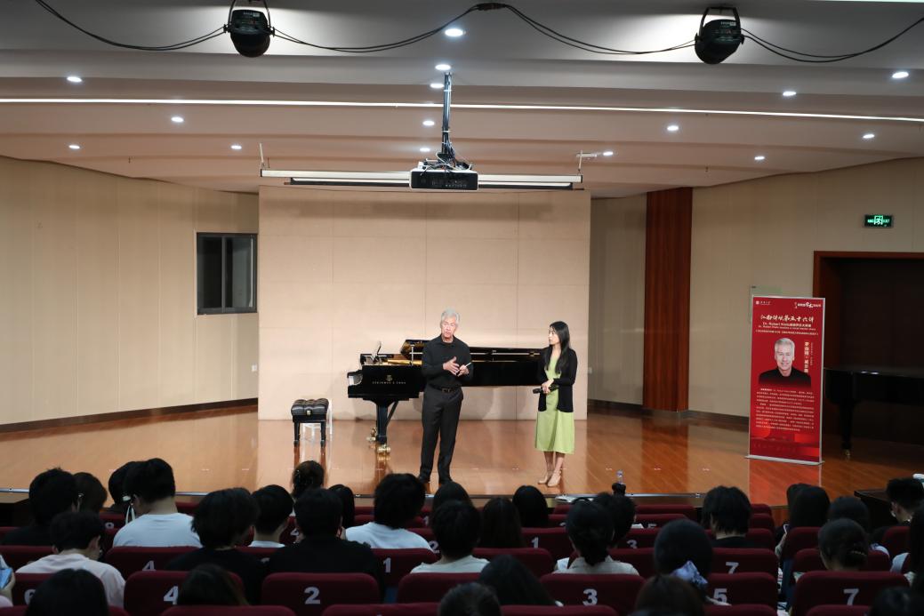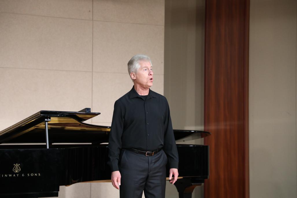 随后,Robert Wells教授亲自示范演唱了风格迥异的四首歌曲,第一首歌曲是英国作曲家亨德尔创作的意大利语作品《暴风骤雨》(选自歌剧《奥兰多》),第二首歌曲是德国作曲家沃尔夫创作的德语艺术歌曲《郊游》,第三首歌曲是法国作曲家弗雷创作的法语艺术歌曲《夜曲》,第四首歌曲是英国作曲家芬奇创作的英文歌曲《谁是希尔维亚》。演唱结束后,现场掌声如雷,Robert Wells教授富有感染力的松弛嗓音和卓越的声乐技巧,不仅赢得了学生们的热烈掌声,也激发了他们对声乐艺术的无限热情。