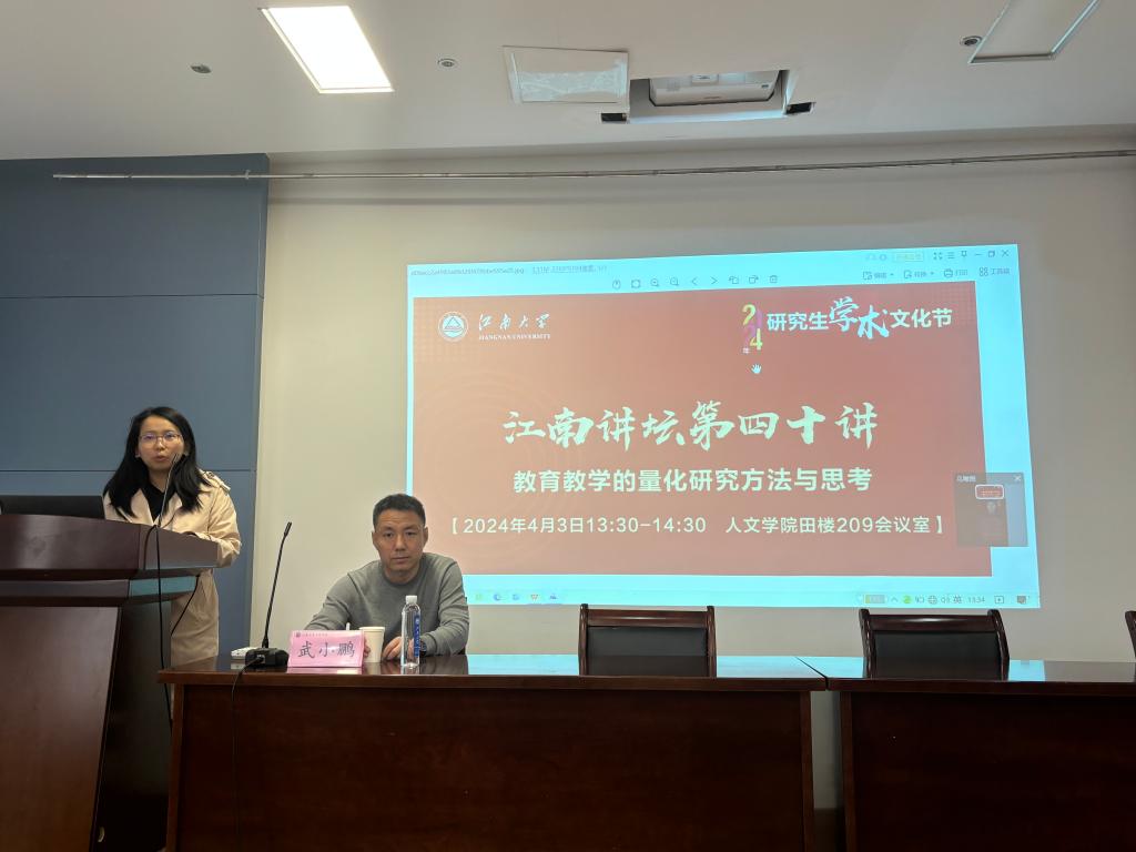 2024年4月3日下午,由江南大学研究生院主办,人文学院承办的江南讲坛第四十讲在田家炳楼209报告厅顺利举行。讲座邀请到了东北师范大学教育学部武小鹏教授,他报告的题目是“教育教学的量化研究方法与思考”。讲座由人文学院李丹杨老师主持,人文学院师生代表共计100余人参加。