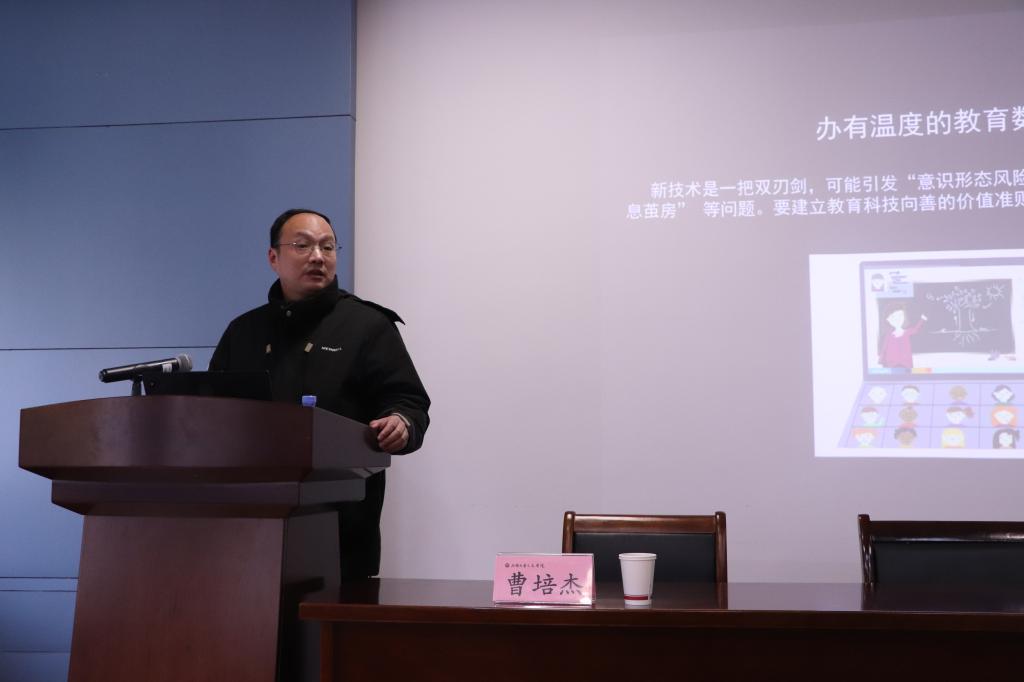 2024年12月7日下午,人文学院2024年第二期硕士生导师培训在田家炳楼209顺利开展。本次培训特邀中国教育科学研究院数字教育研究所所长曹培杰做主题为“数字化赋能教育强国建设的发展路径”的专题讲座。讲座由王文礼教授主持,人文学院全体研究生导师以及百余名学生到场聆听。
