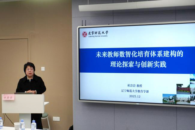 围绕未来教师数智化培育体系,杜岩岩从三个维度展开解析:在理论逻辑层面,聚焦教育与教师的未来想象、数智素养框架建构,以结构化理论视角梳理培育体系的核心思路;在核心组件层面,明确“师-生-机”三元培育主体及互动关系,整合技术、数据、场景、平台四类资源,并锚定育师目标、核心价值取向与技术应用准则等培育规范;在实践探索层面,她分享了辽宁师范大学“AI+VR”数智化育人的落地经验,包括“价值一贯、三级递进”的教育学人才培养框架、“数据驱动+虚实融合+AI伴随”的沉浸式教学场景,以及“过程-预测”双导向评价体系等创新模式,为在场师生提供了可借鉴的具象范式。