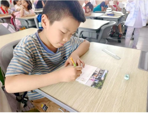 5月27日,尚贤万科小学三年级教室里,江南大学支教团成员通过播放支教实景视频、分享山区教育现状,为小学生上了一堂生动的公益启蒙课。互动环节中,学生们踊跃提问:“山区小朋友每天走多远上学?”“他们最喜欢看什么书?”随后,每个学生在定制明信片上写下真挚寄语,请大学生志愿者把祝福带去大山里。