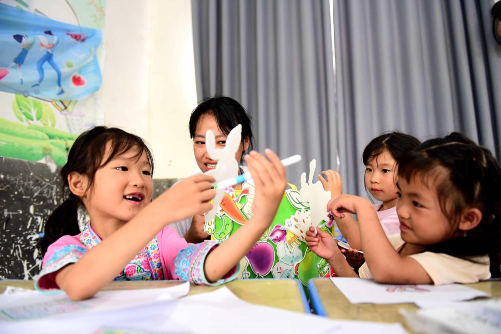 △2025年7月16日,贵州黔东南州从江县,江南大学支教老师在独洞小学指导学生制作绘本彩绘。
