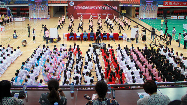 正式比赛前,本次比赛的裁判长、人文学院副院长符姗姗老师宣读比赛规则。比赛正式开始后,一支支整齐有序的参赛队伍身着各色服饰陆续登场,展现出的不再是大众印象中戏曲的“唱、念、坐、打”,也不仅是体操动作的“横平竖直”,而是在体操运动的基础上,把戏曲身段动作中的“腕花小云手”、“飞天十三响”、“拉山膀”、“亮相”、“涮腰”等融入整套动作,两者结合相得益彰,浑然天成。一招一式,收放自如,时而流畅有力,时而婉约柔美,配合着恰到好处的节律,用肢体动作这种无声的语言,使得情动于中而发于外。相近的舞蹈内容,在不同学院的精心演绎下展现别样的精彩风貌,通过动作改编和队伍排列展现别具的匠心。“自由运动”里,大家发挥想象力,自由展示,动作效果虽不能与行家相媲美,却也将迂回婉转的东方美和自成一派的潇洒体现得淋漓尽致,充分展现了江大学子蓬勃的青春与朝气。