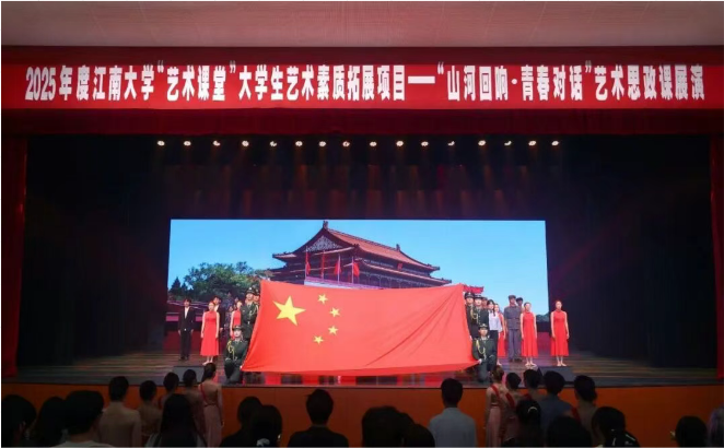 9月24日晚,为纪念中国人民抗日战争暨世界反法西斯战争胜利80周年,由江南大学党委宣传部、融媒体中心、人文学院(教育学院)及国家大学生文化素质教育基地联合主办的“艺术课堂”思政课展演《山河回响•青春对话》在江南大学文浩科学馆隆重举行。校党委副书记倪松涛,党委宣传部部长李佳敏,人文学院党委书记王晖出席本次展演,展演通过丰富的艺术形式,为师生呈现了一堂生动而深刻的思想政治教育课。