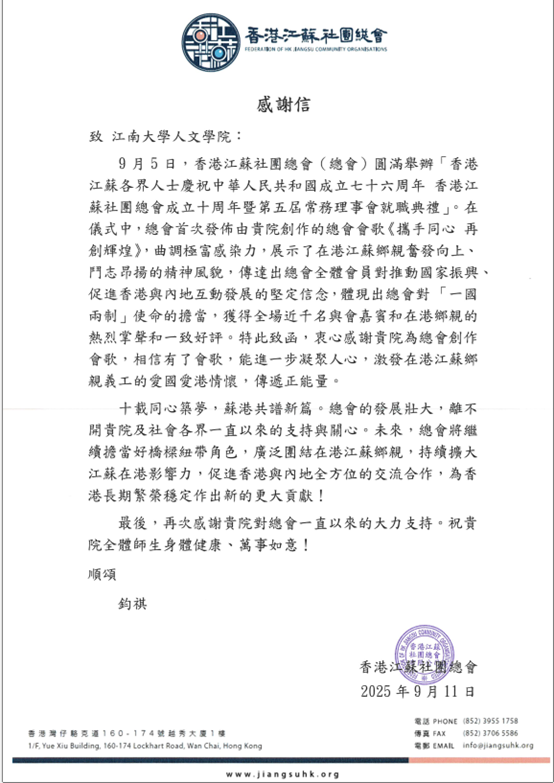 2025年9月11日,江南大学人文学院收到香港江苏社团总会感谢信,信中对江南大学人文学院在9月5日举行的香港江苏各界人士“庆祝中华人民共和国成立七十六周年暨总会成立十周年庆典”中的贡献给予高度评价。典礼上,由江南大学原副校长王武教授参与歌词创作,人文学院胡永强等教师作曲的会歌《携手同心再创辉煌》首次发布,其铿锵旋律与家国情怀引发全场近千名嘉宾热烈反响,成为活动亮点。