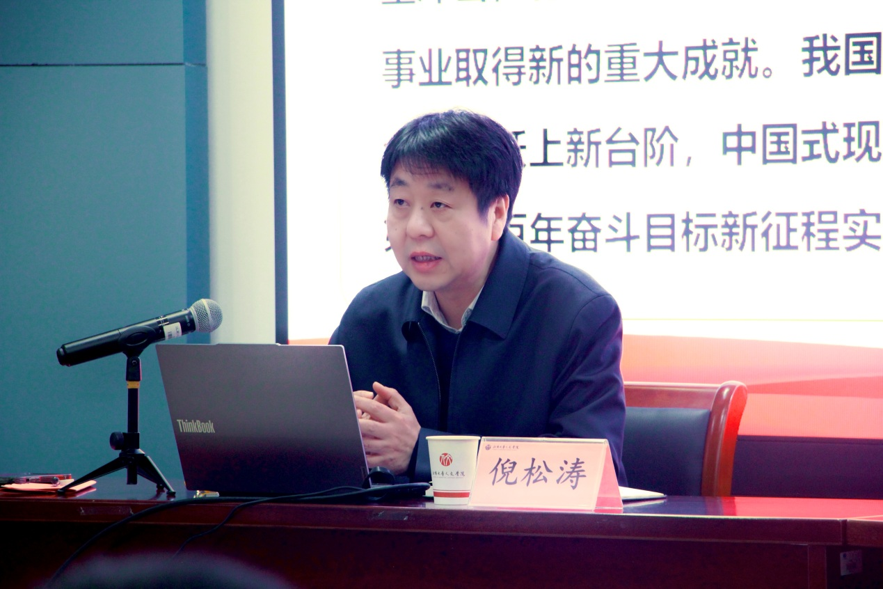 为深入学习贯彻党的二十届四中全会精神,引导广大师生准确把握全会核心要义,深刻认识新时代高校的使命担当,12月10日,校党委副书记倪松涛深入人文学院,以《擘画新蓝图,奋进新征程——学习贯彻党的二十届四中全会精神》为主题,为学院师生讲授了一堂深刻而生动的专题宣讲。教技系教工党支部全体党员、汉师2203、小教2304团支部全体学生、学院师生代表等参加本次学习。活动由人文学院党委书记王晖主持。