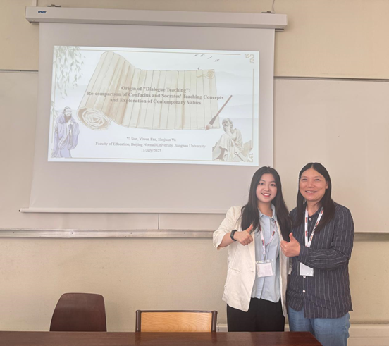当地时间7月11日上午11点,于书娟还参加了《变革时代的教学方法和价值观》小组会议,参与汇报了与北京师范大学孙益、樊伊文合作的《孔子与苏格拉底对话式教学的比较研究》报告,并在报告结束后与与会者就二者对话教学的异同、当代价值进行了交流。
