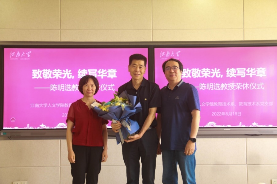 砥砺前行、艰苦奋斗的精神,请陈明选教授将珍贵的故事和经验记述并留传下来,为学院与学科发展再添一份力量。支部组织委员牟智佳谈起陈明选教授对我们的影响可以用“一师一者”来概括,一师是指他是我们年轻老师的人生导师,关注我们的专业发展和成长;一者是指他是健康生活的行动者,这种良好的行为习惯激励着我们年轻老师,既要工作好,也要锻炼好身体。舒杭作为一名新入职的年轻教师,同时也是教技支部的发展对象,表示这场温馨隆重的荣休仪式,是一种荣誉、一种肯定,对自己而言,则是一种发扬、一种传承,要学习老一辈党员无私奉献的精神,以实际行动为专业发展添砖加瓦。