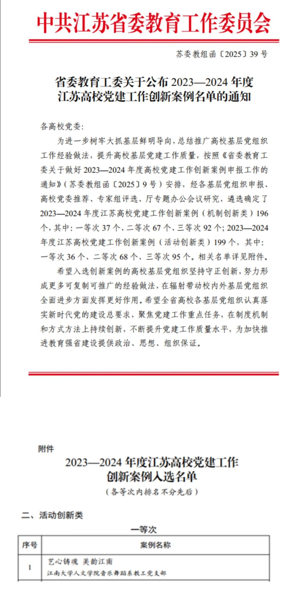 获评的4项江苏高校党建工作创新案例中唯一的活动创新类一等次。