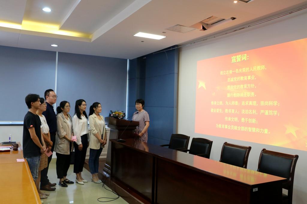 大家庭表示感谢并表达了向老教师学习、努力实践教书育人理想的愿望。荣休教师陈平带领新教师进行入职宣誓。庄重而热烈的仪式让所有与会教师都深受感动与鼓舞,在水果派