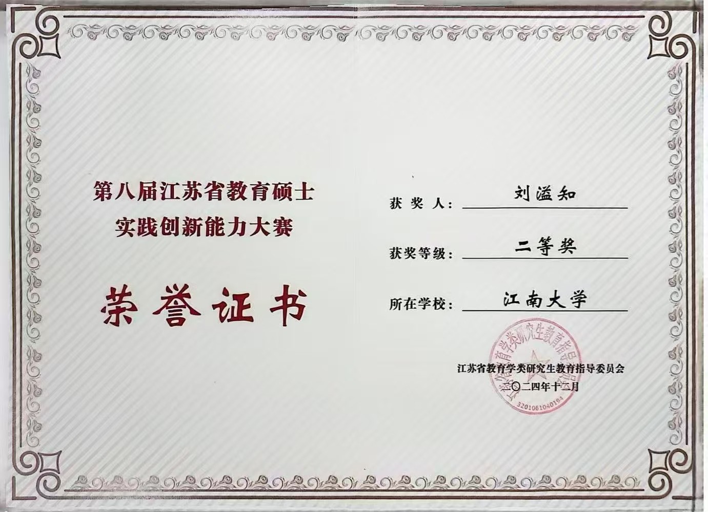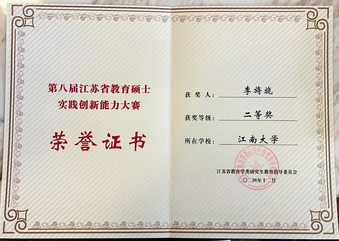 学科教学(语文)刘溢知、学科教学(英语)王佳等2名同学获中学文科综合组二等奖;李旖旎同学获学前小教组二等奖;刘姝含、陈欣怡分别获中学文科和中学理科组综合组优胜奖。