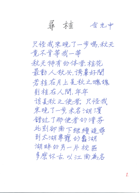2012年10月,台湾诗人余光中先生来访,给水果派 师生做了三场报告,并写了两首诗作:《寻桂》和《不甘秋去》。他说:“母土情深,此行难忘,桂花仍香,有诗为证。”