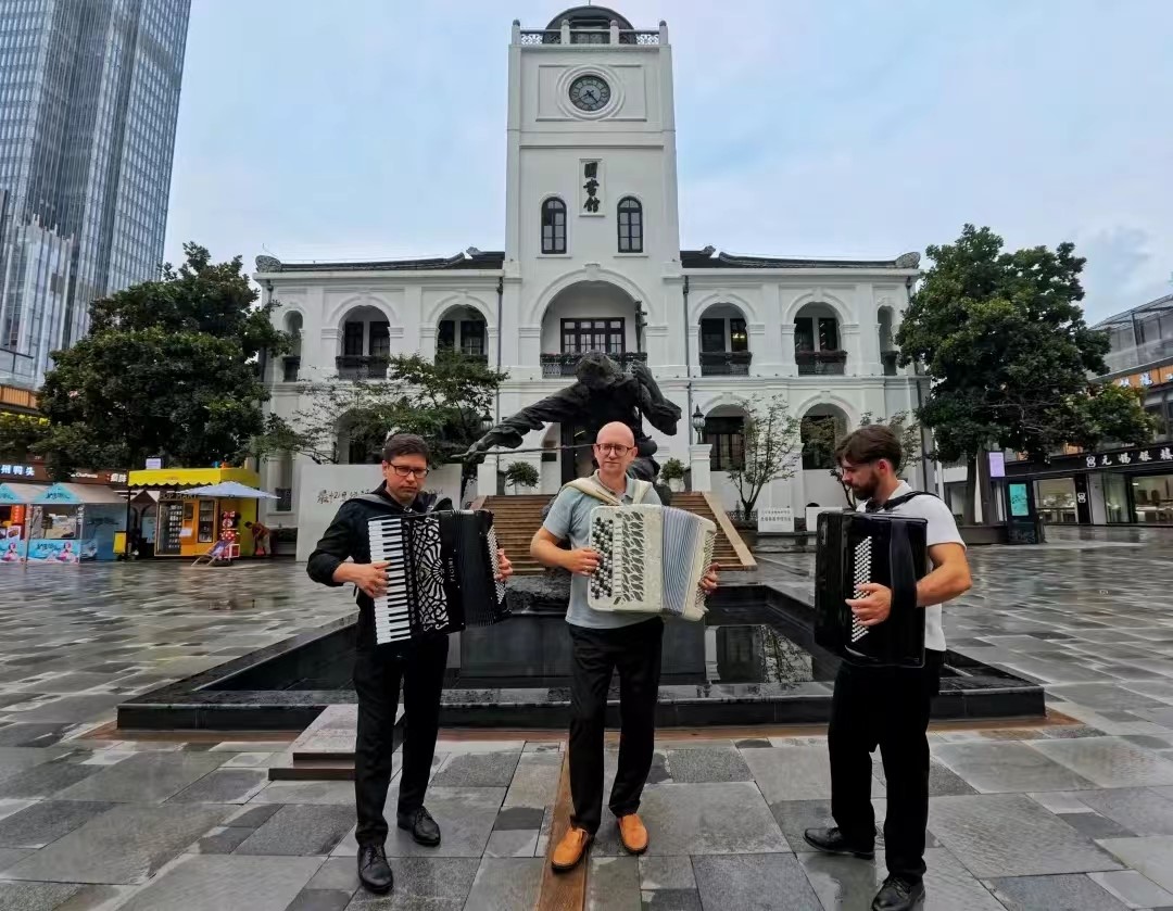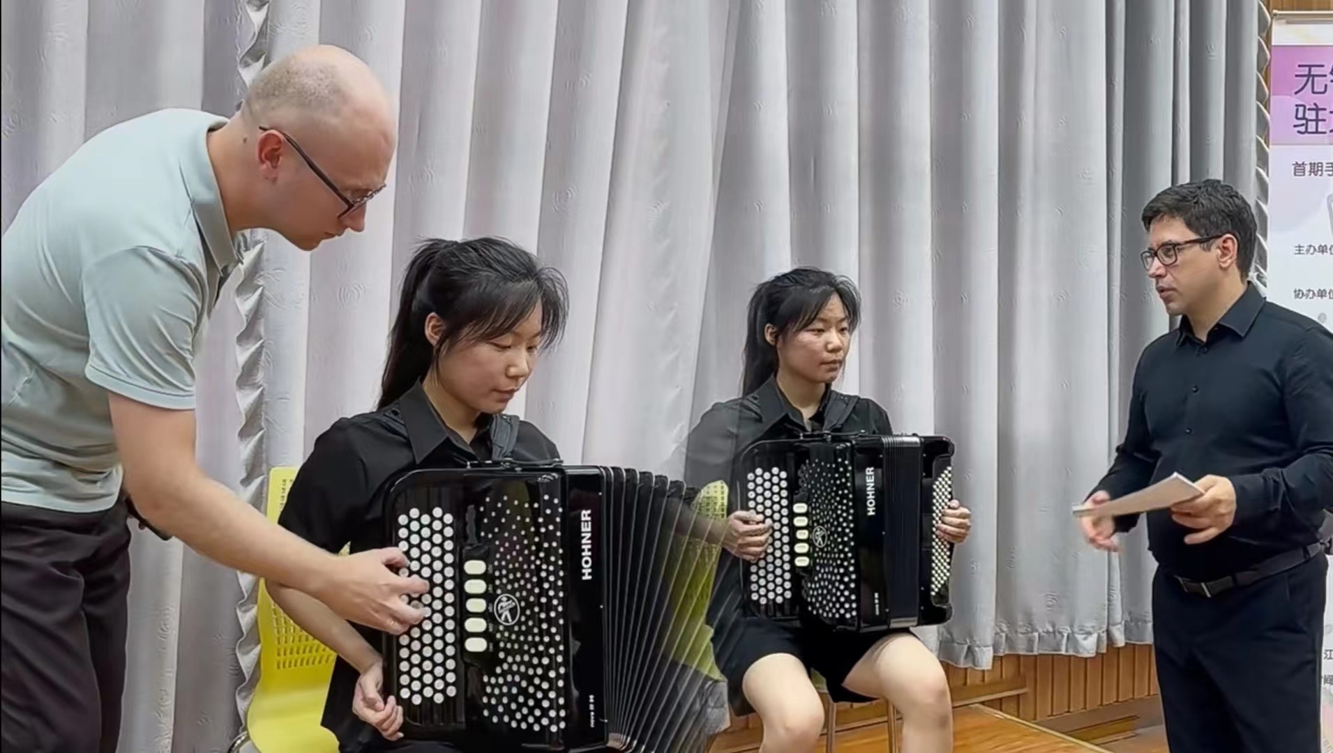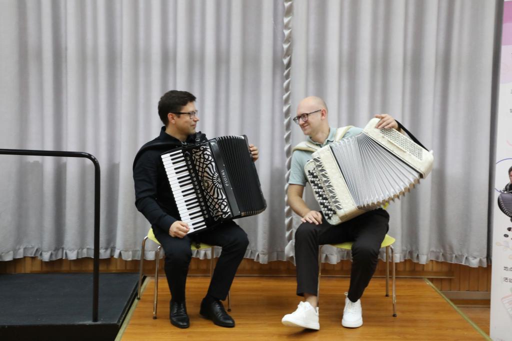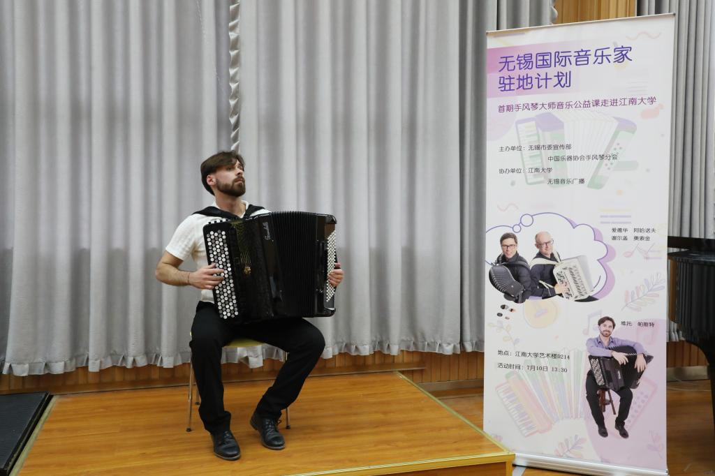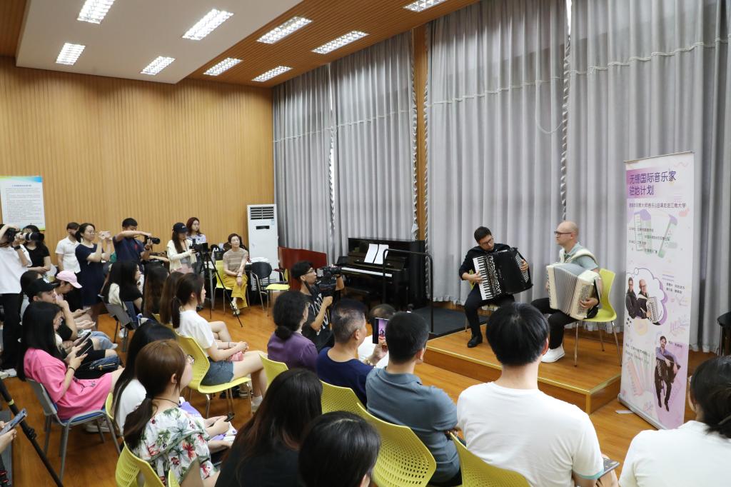 2024年7月10日下午13:30,无锡市委宣传部与中国乐器协会手风琴分会联合主办的无锡国际音乐家驻地计划——首期手风琴大师音乐公益课于江南大学艺术楼D214成功举行。本次活动由江南大学人文学院承办,特邀俄罗斯青年手风琴演奏家、作曲家爱德华•阿哈诺夫,莫斯科国立施尼特凯音乐学院教授谢尔盖•奥索金,以及葡萄牙青年才俊维托•帕斯特三位大师,共同为师生呈现了一场精彩绝伦的艺术展演与手风琴大师课。本次活动由江南大学人文学院副院长王芳教授主持,中国音协手风琴学会副秘书长、上海师范大学音乐学院王从余教授亲临现场,与江南大学音乐系50余名师生共同参与。