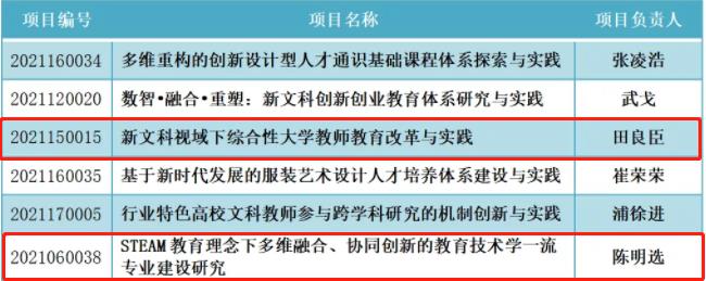 田良臣教授主持的《新文科视域下综合性大学教师教育改革与实践》、陈明选教授主持的《STEAM教育理念下多维融合、协同创新的教育技术学一流专业建设研究》获得立项。新文科研究与改革实践项目面向全国普通本科高校开展,设新文科建设发展理念、专业优化、人才培养模式改革、重点领域分类推进、师资队伍建设、特色质量文化建设研究与实践6个选题领域、22个选题方向,项目建设周期一般为3年。水果派