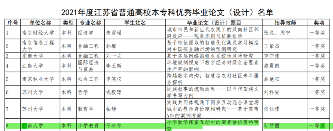 小学教育专业2017级本科生任冰尔的毕业论文《小学数学课堂互动中的回音话语策略研究》荣获一等奖,指导教师为教育系的孙丽丽副教授。