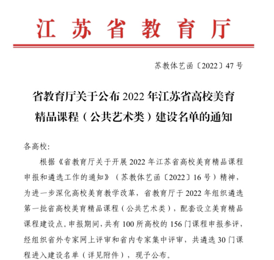 近日,江苏省教育厅公布了首批省高校美育精品课程(公共艺术)建设名单,入选课程共计30门。由王芳教授主持,陈妍、马静、冯程程、刘俊、叶凌飞、郑雯雯、于书娟、王志军、张春梅等多位教师共同参与建设的课程《舞蹈美育与综合素质教育》,从全省100余所高校的156门课程评审中脱颖而出并成功入选。